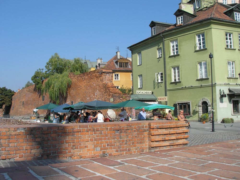 Handel na murach staromiejskich już nieco ucywilizowany - nawet parasole jednakowe.