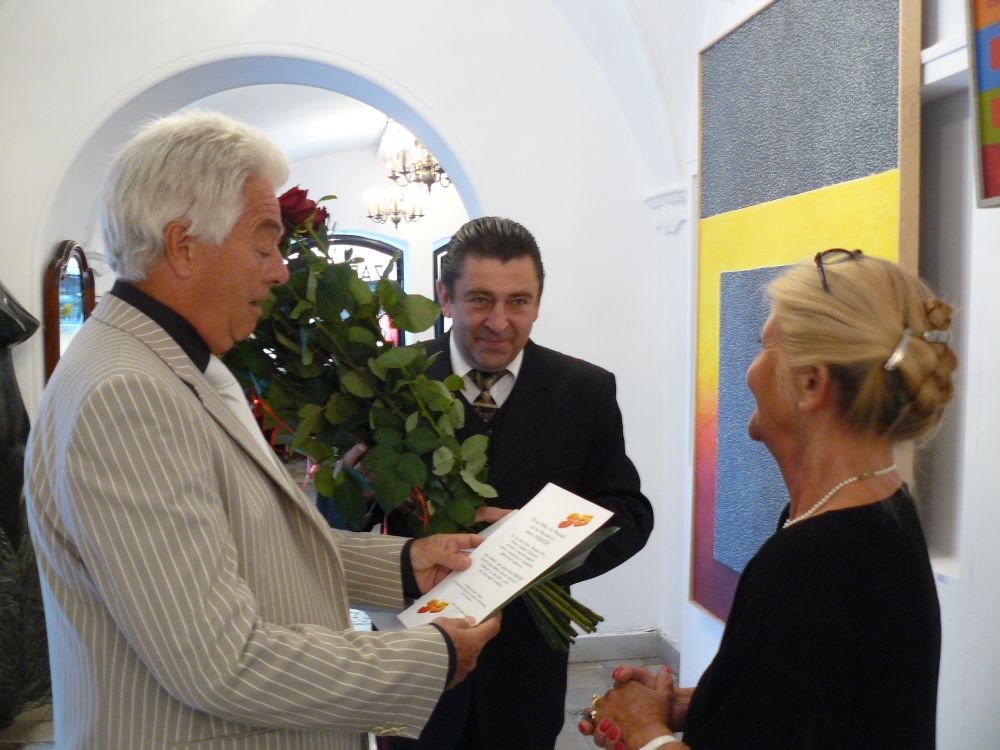 Honorowy dyplom i piękne róże dla Pani Miry Arens z okazji 35-lecia Galerii "Zapiecek". Kwiaty wręczają: przewodniczący Stowarzyszenia Roman Popowski i wiceprzewodniczący Janusz Lück