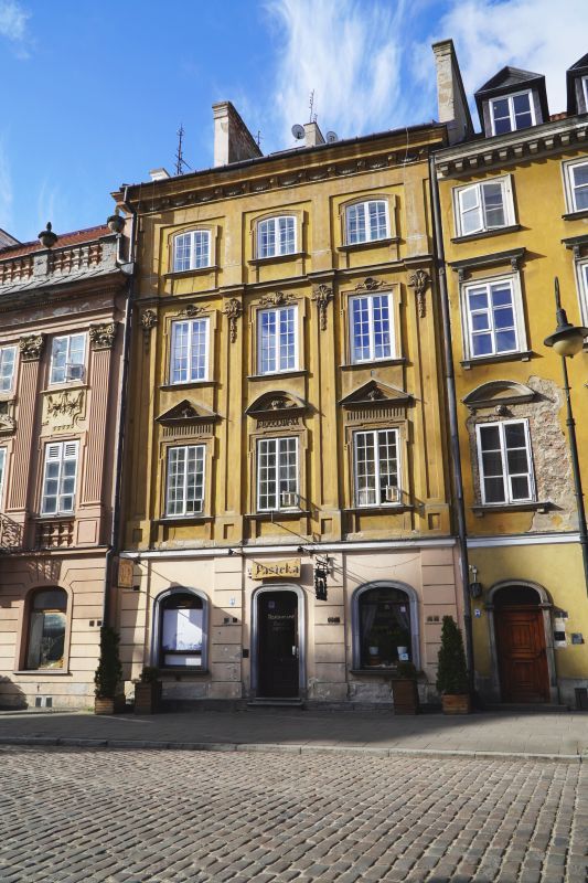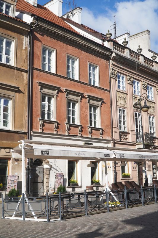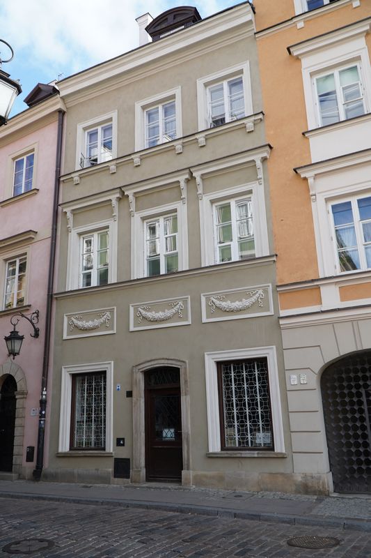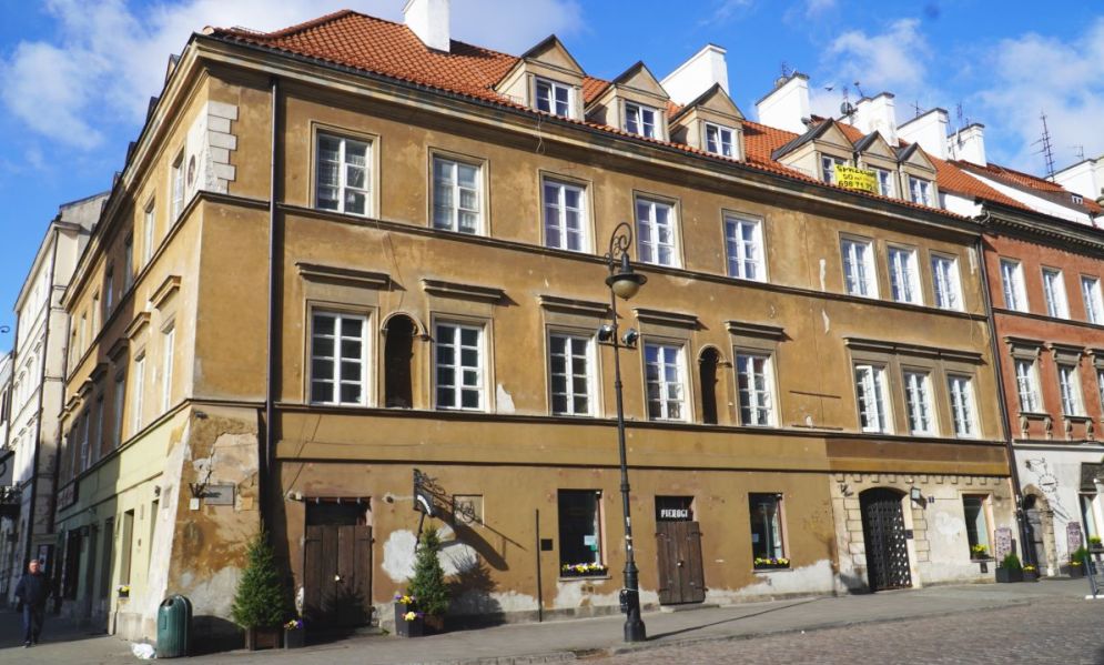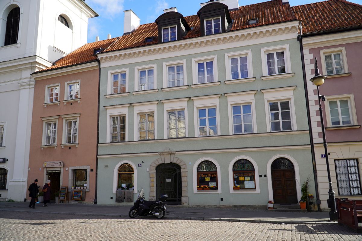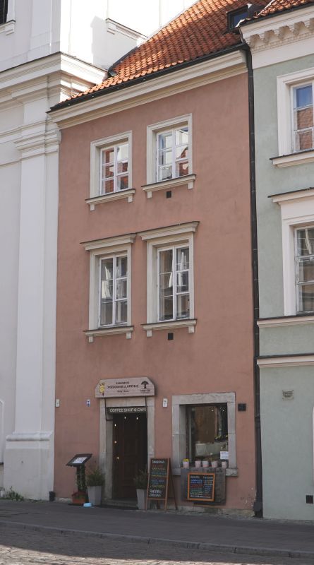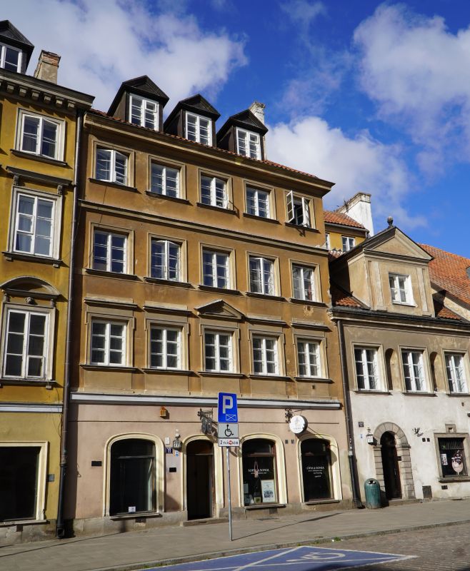 Kamienica narożna, trójosiowa, dwupiętrowa. Wybudowana ok 1740 r., (wg innych źródeł w 1753) dla Jana Gidelskiego kupca korzennego, rajcy miasta Starej Warszawy. W latach 1790-94 mieszkał tu architekt i malarz Innocenty Maraino *) scenograf Teatru Narodowego (Wojciecha Bogusławskiego).