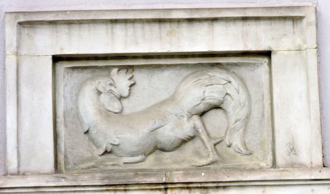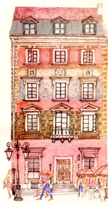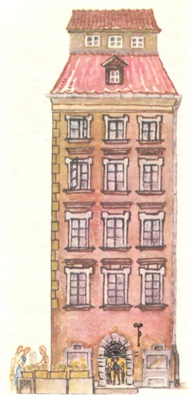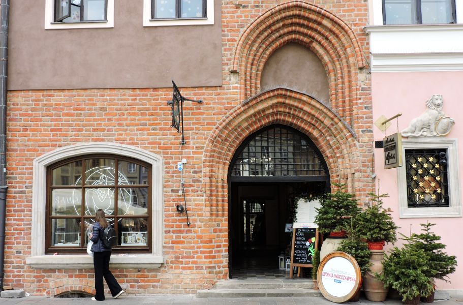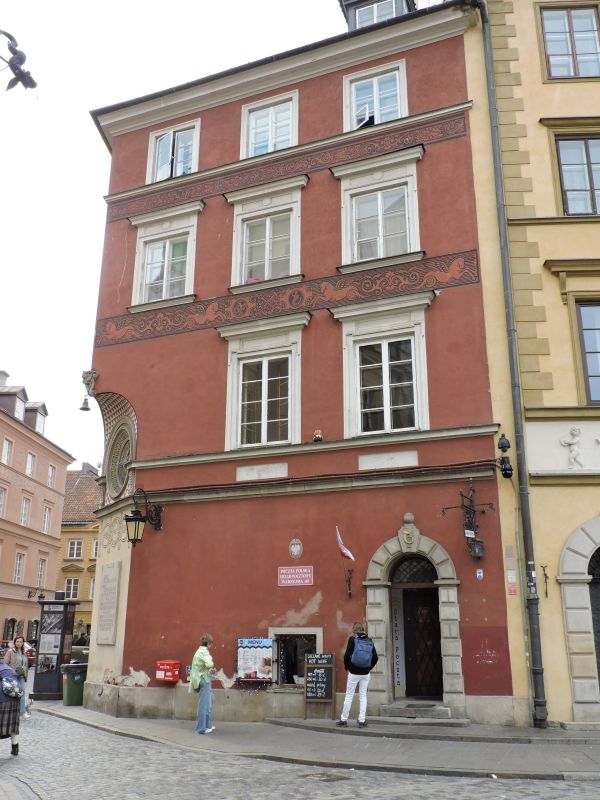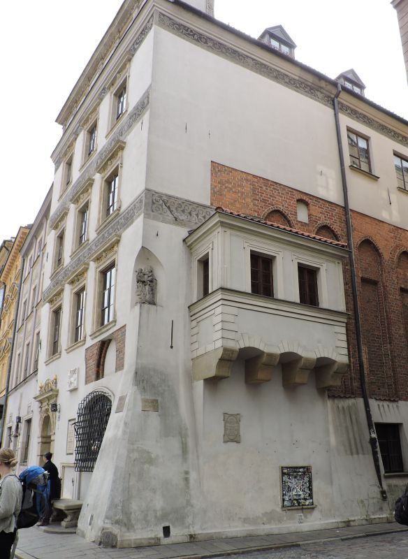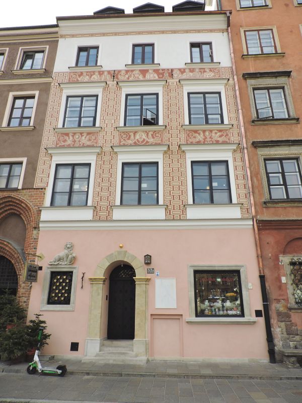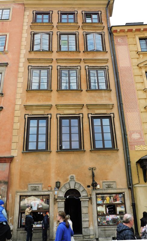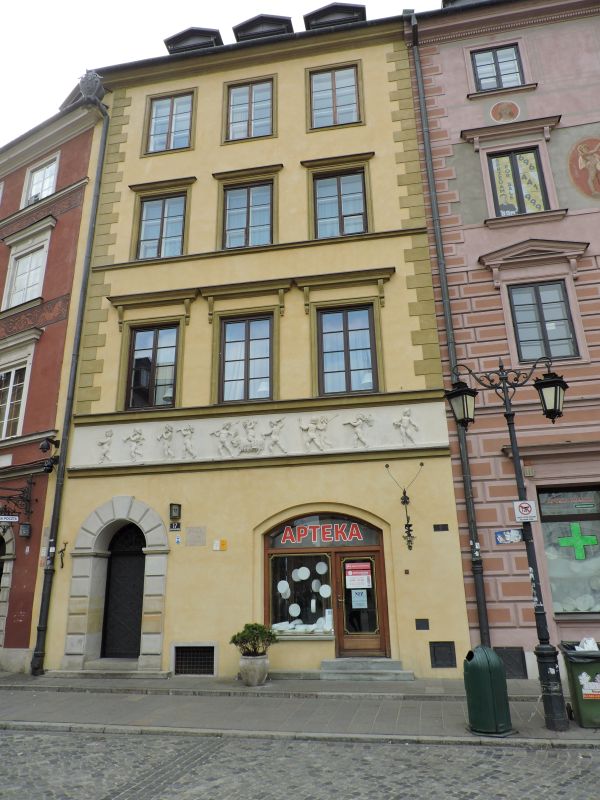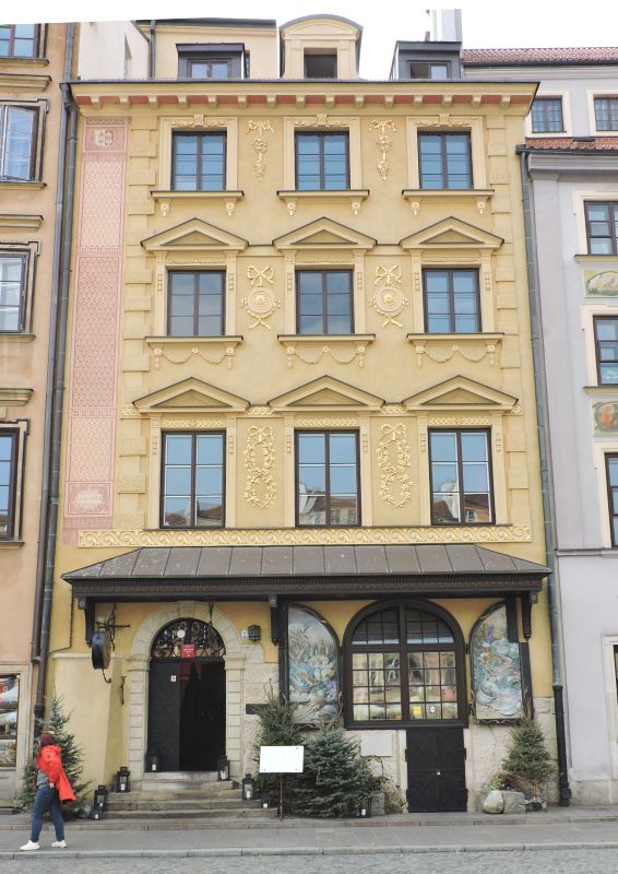 Po zniszczeniach 1944 zachowane piwnice i fragmenty murów przyziemia z portalem. Odbudowana 1951-53 wg proj. Waclawa Podlewskiego, z zachowaniem ocalałych reliktów, odtworzeniem bryły i fasady sprzed 1944, zachowującej wygląd z połowy. w. XVIII, z nowo projektowaną elewacją tylną i wnętrzami. - Czterokondygnacjowa, trzytraktowa (wnętrza połączone z kamienicą nr 31). Na wyższych kondygnacjach poilichromia (martwe natury i amorki) wyk. 1953 przez Zofię i Romana Artymowskich. Dach z trzyokienną latarnią.