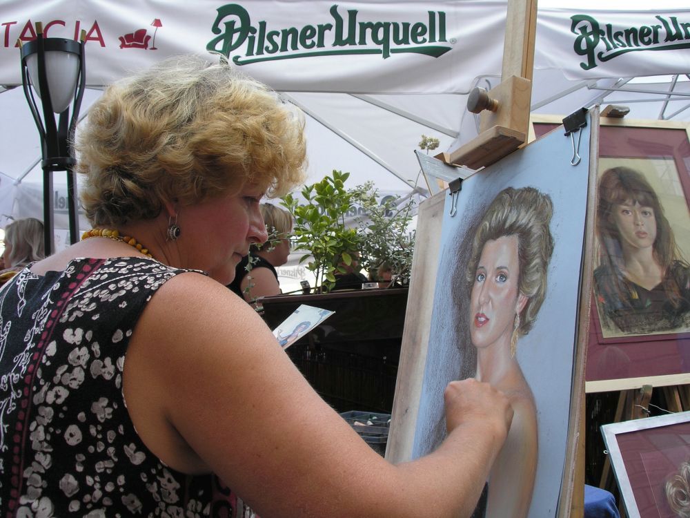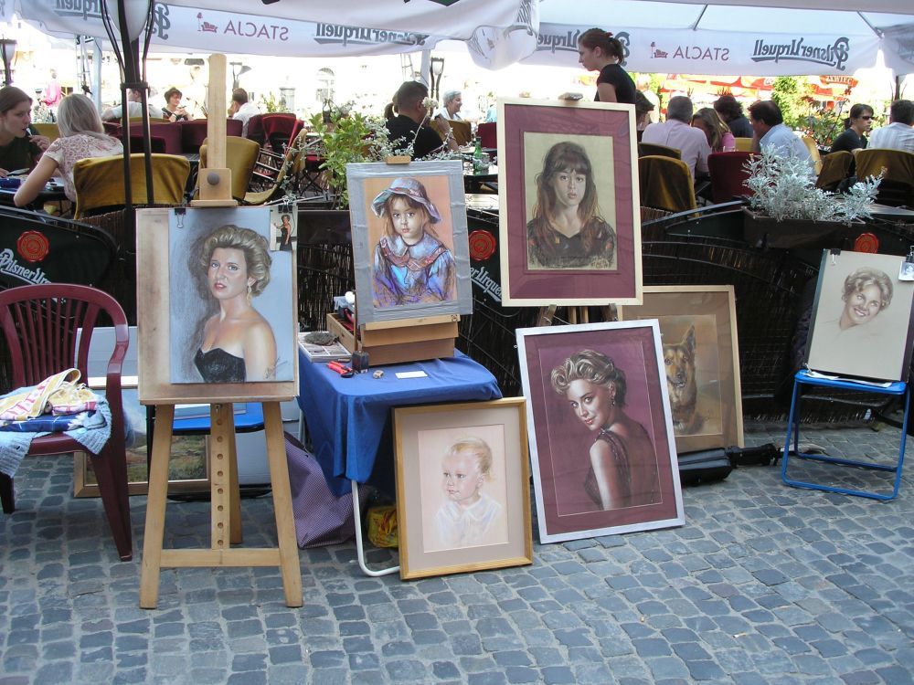 Handel na murach staromiejskich już nieco ucywilizowany - nawet parasole jednakowe.