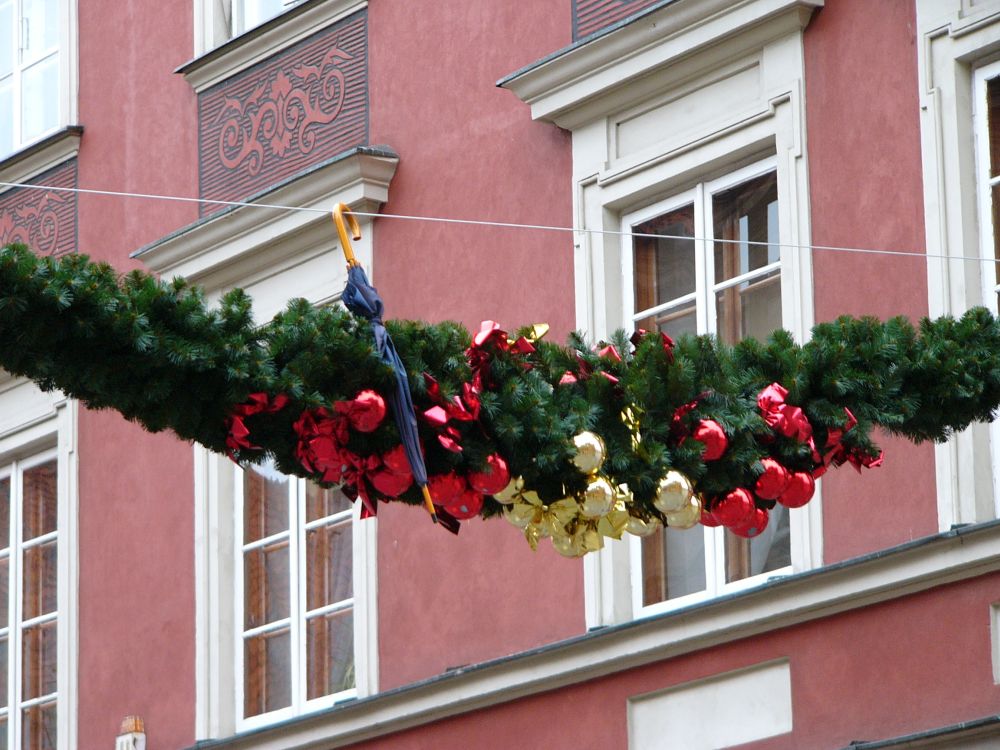 Girlanda na Zapiecku, w ramach dekoracji świątecznej ktoś dorzucił parasol.