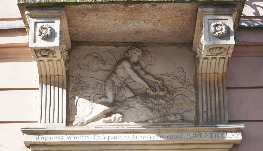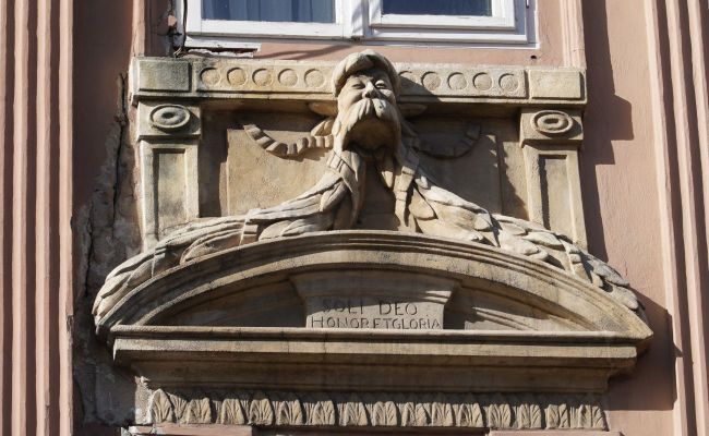 Na elewacji są jeszcze mniejsze dekoracje malarskie. W podłużnych polach międzyokiennych widać: ? w lewym - przybory kreślarskie (ekierkę, przykładnicę, rulony kalek czy plany), ? w środkowym - pień ściętego drzewa z młotkiem i cyrklem cieśli, ? w prawym - narzędzia pracy murarzy i malarzy. W dwóch kwadratowych polach są dwa dodatkowe malowidła. Na jednym strzaskana kolumna i smutna twarz kobiety."