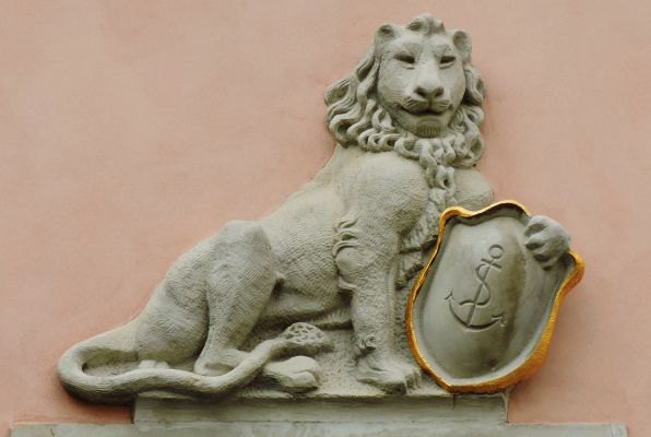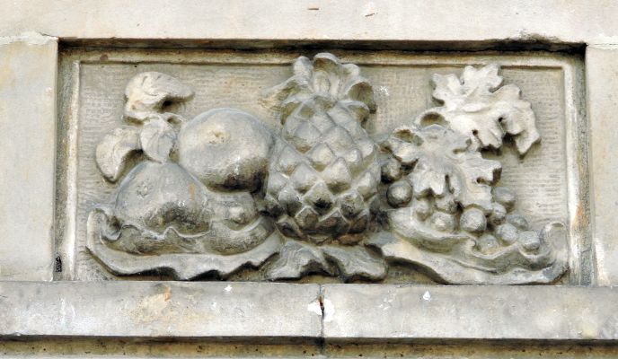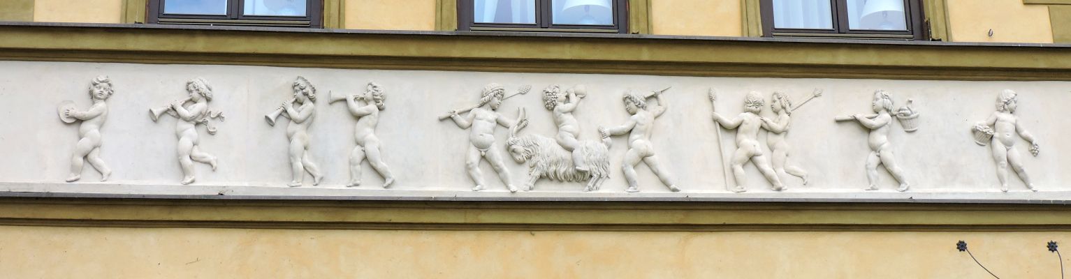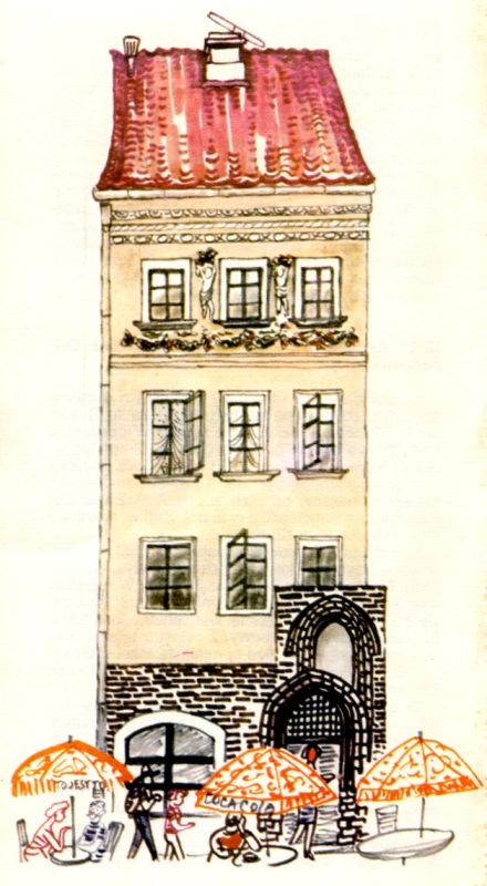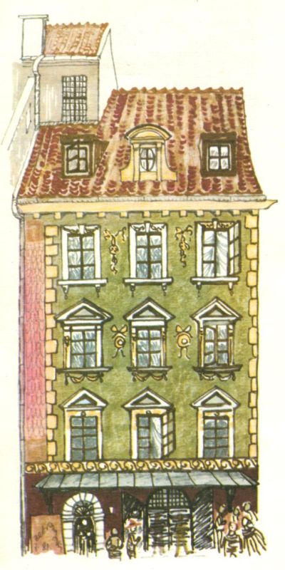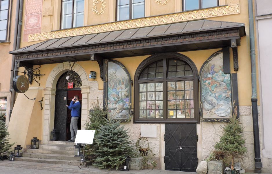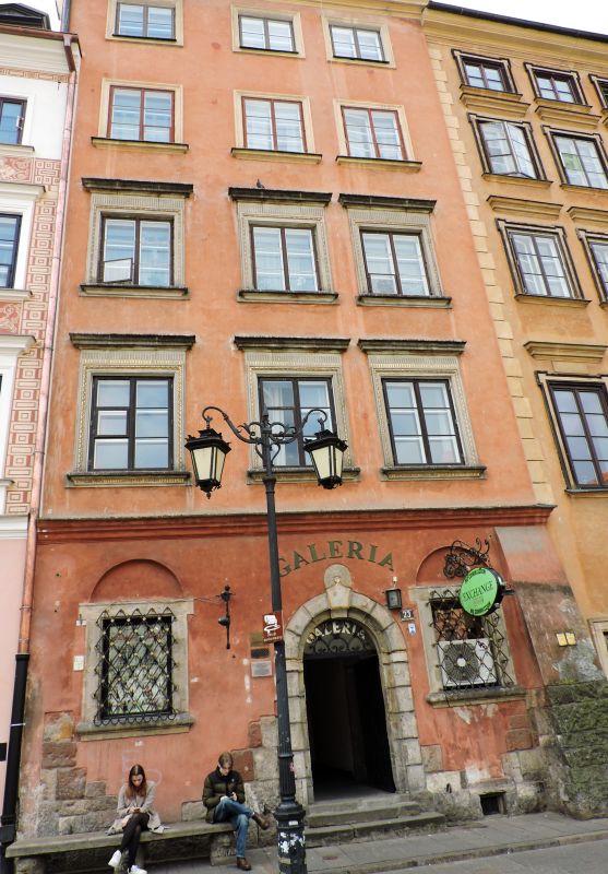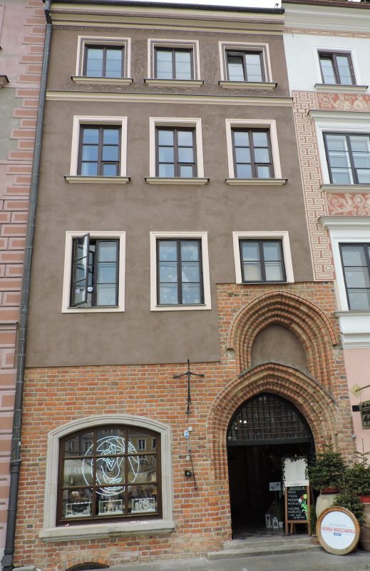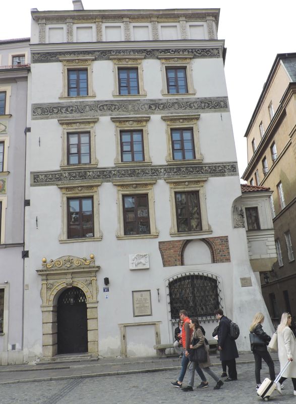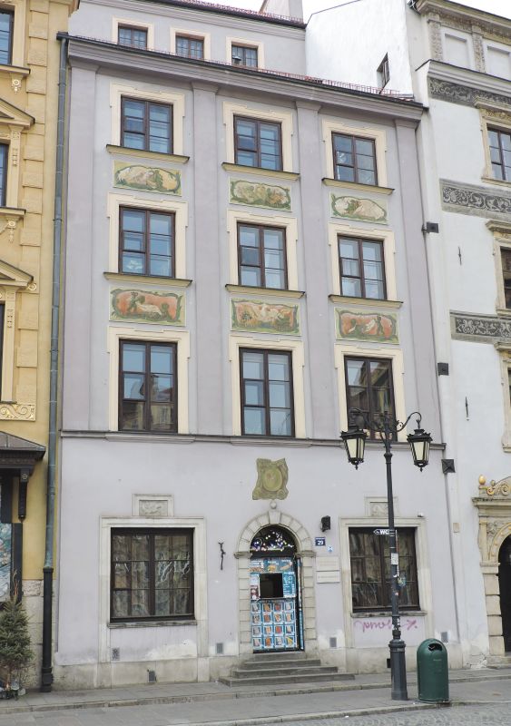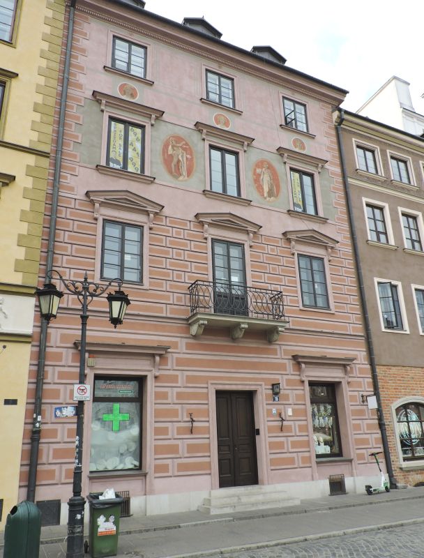 Po zniszczeniach 1944 zachowane piwnice i fragmenty murów przyziemia z portalem. Odbudowana 1951-53 wg proj. Waclawa Podlewskiego, z zachowaniem ocalałych reliktów, odtworzeniem bryły i fasady sprzed 1944, zachowującej wygląd z połowy. w. XVIII, z nowo projektowaną elewacją tylną i wnętrzami. - Czterokondygnacjowa, trzytraktowa (wnętrza połączone z kamienicą nr 31). Na wyższych kondygnacjach poilichromia (martwe natury i amorki) wyk. 1953 przez Zofię i Romana Artymowskich. Dach z trzyokienną latarnią.